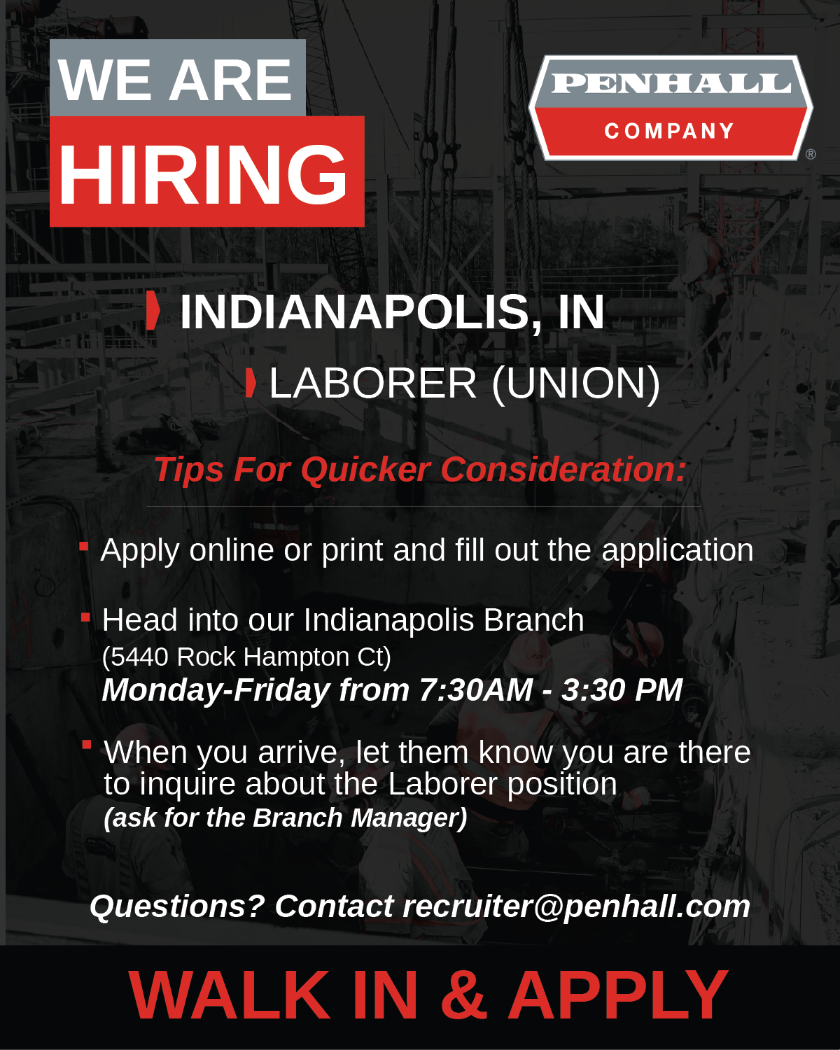 🚧 Indianapolis – We’re Hiring Laborers (Union) Looking to get to work? Walk in and apply in person. 🟥 Monday–Friday | 7:30 AM – 3:30 PM 🟥 Penhall Indianapolis Your next opportunity could start here. Apply online ➝ https://buff.ly/b3hKEEj #PenhallNowHiring #IndianapolisHiring #UnionLabor #Pen...Read more